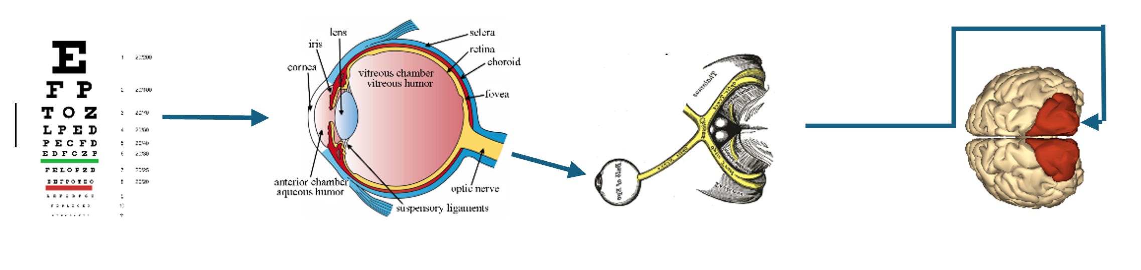 The diagram traces the route of visual information: from raw input at the foveal cones, through preprocessing, into the optic nerve, and onward to the occipital V1 cluster.