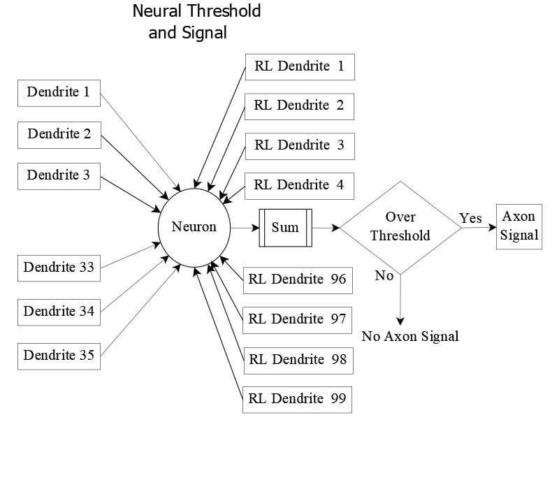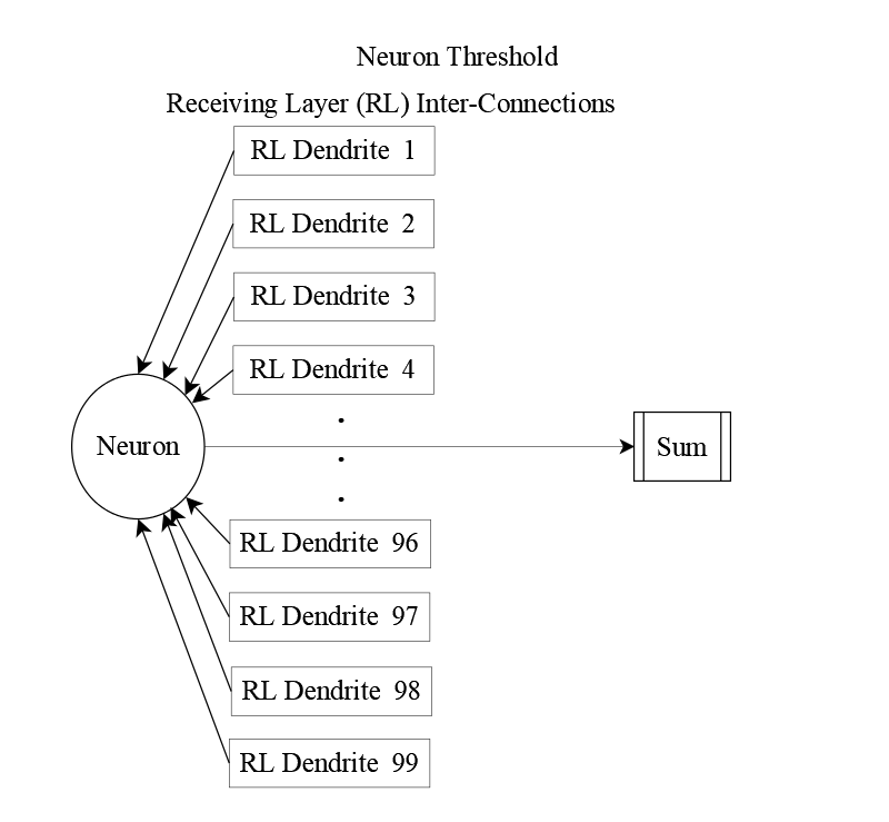 Here, the neural summation becomes more concrete. The total input to neuron , Sumj, is compared against a threshold of 15 mV. If this threshold is met or exceeded, neuron fires—sending a 100 mV signal down its axon to downstream targets.