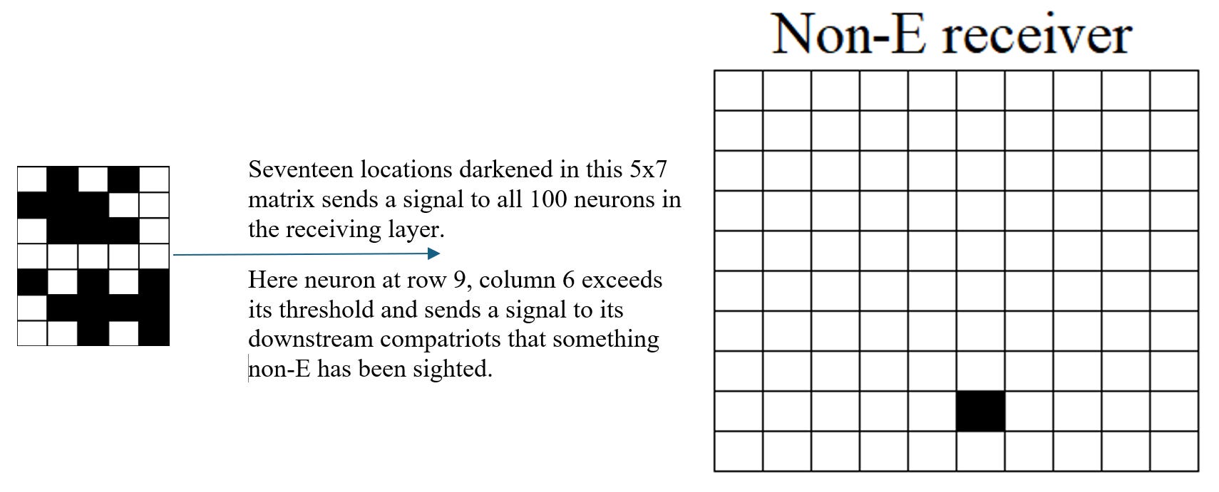 In contrast, a jumble of 17 active sensory cells fails to trigger recognition. Although the number of signals is the same, the spatial pattern lacks the structural features—such as aligned edges and intersections—that define E. The network does not categorize this input as E, and no signal is sent from neuron (2,2).