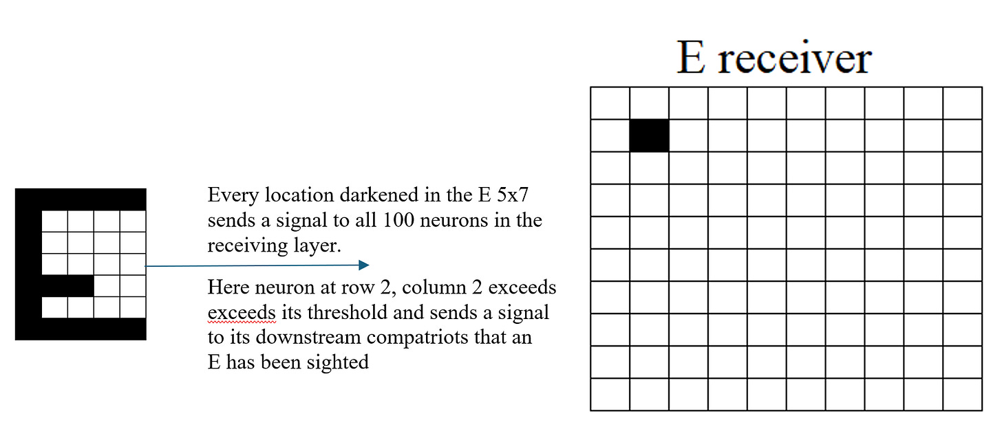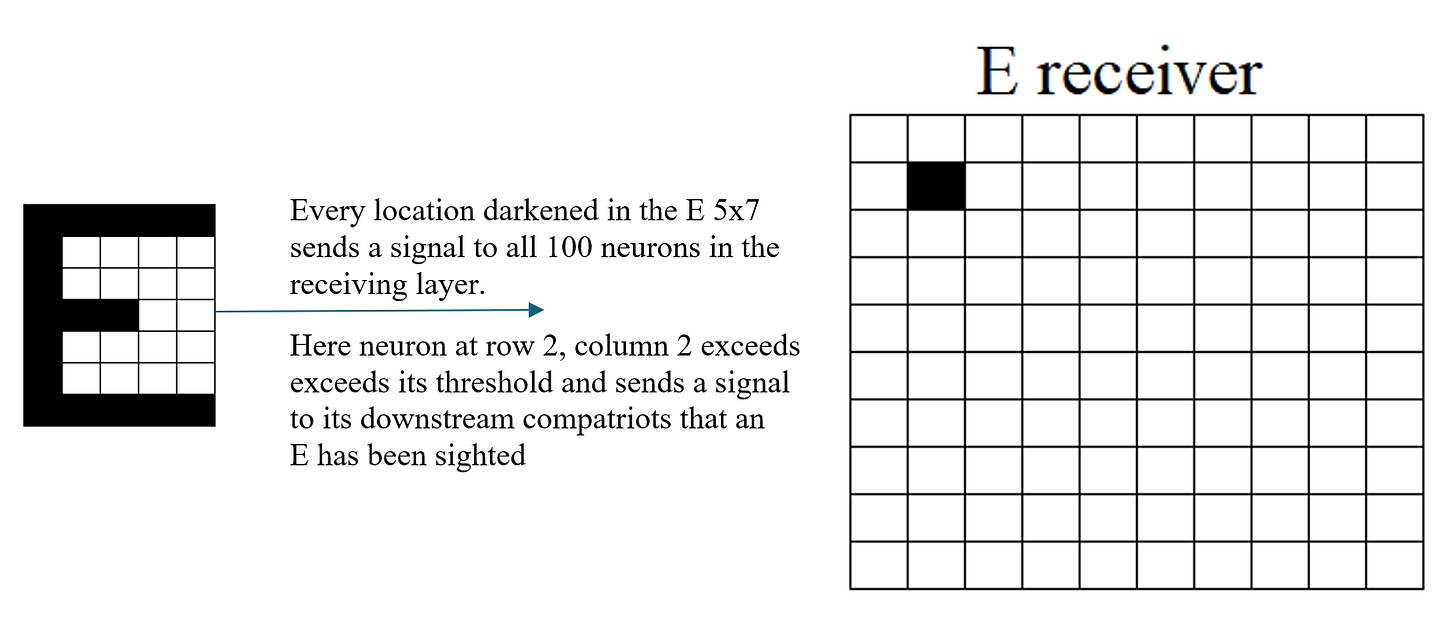 In this example, the network has learned to recognize the capital letter E. When the sensory pattern for E is presented, neuron (2,2) in the receiving layer exceeds its threshold and sends a signal to downstream neurons—indicating that an E has been sighted.