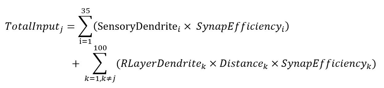But sensory input alone doesn’t tell the full story. Neurons in the receiving layer also send signals to one another, forming a web of lateral connections. Incorporating these interactions yields the complete input equation: neuron j receives 134 distinct inputs—35 from sensory units and 99 from its peers.