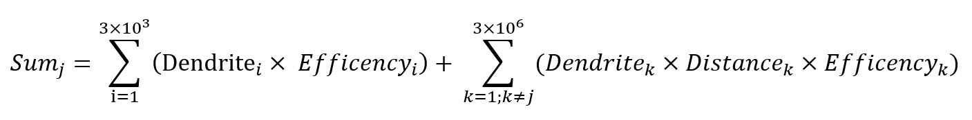 The first summation captures direct sensory input: each of the ~3,000 visual units projects signals to neuron j as well as to the other neurons in the layer. These signals arrive at dendrites with varying transmission efficiencies, reflecting the synaptic strength of each connection.