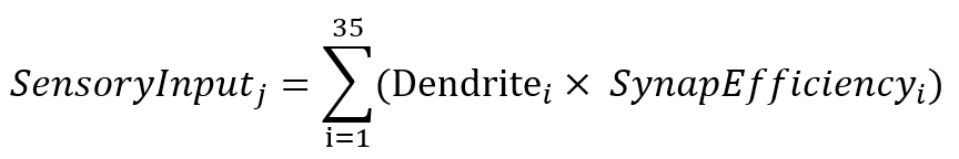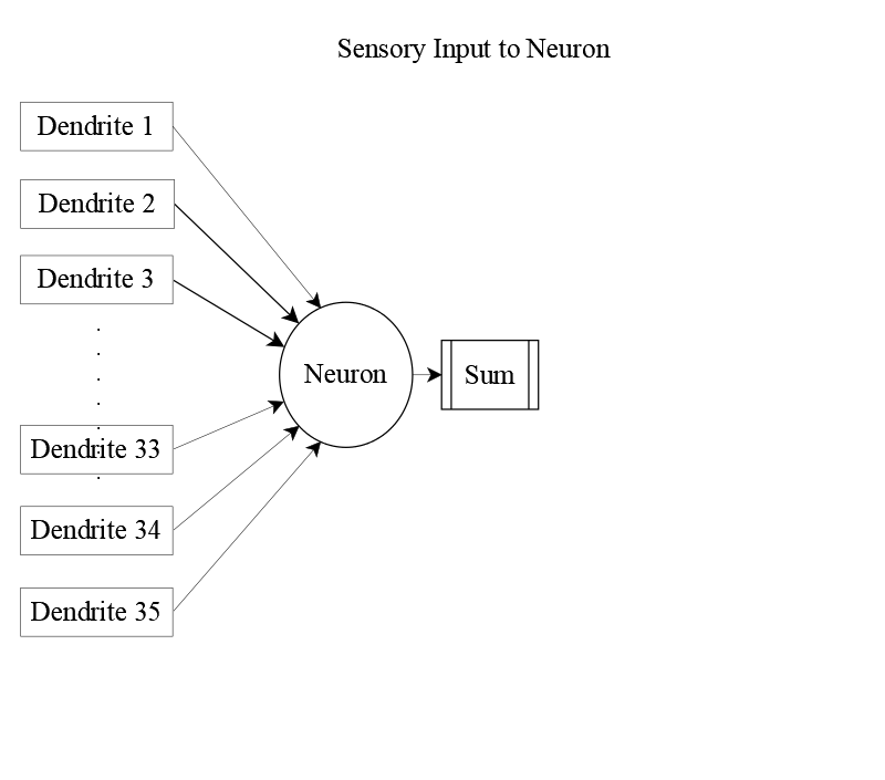 Each receiving neuron integrates signals from all 35 sensory units. These inputs arrive via dendrites and are scaled by synaptic efficiency.