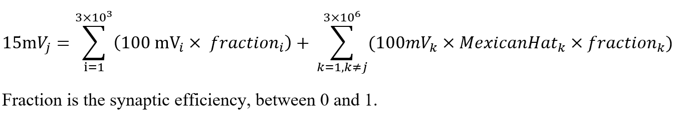 The second summation accounts for lateral input from other neurons in the receiving layer. Each signal is weighted by the Mexican Hat function, which modulates influence based on distance: nearby neurons are excitatory, those slightly farther are inhibitory, and distant ones exert negligible effect. This spatial weighting is then scaled by each connection’s synaptic efficiency.
