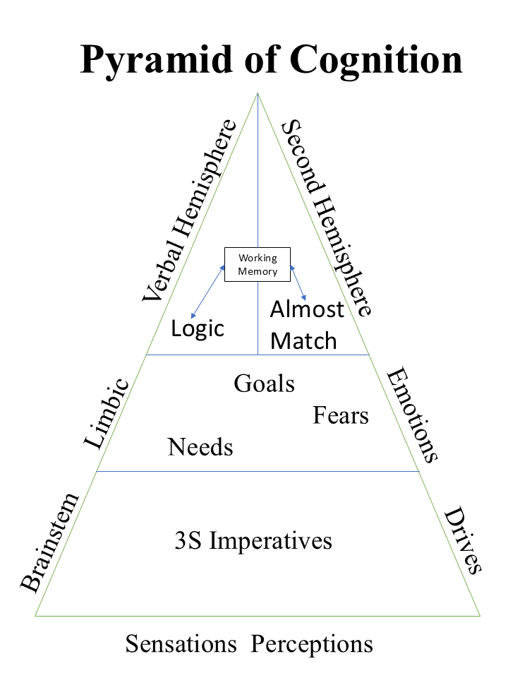 The Pyramid of Cognition (below) encapsulates key relationships between genetic demands, emotional responses, and conscious considerations.